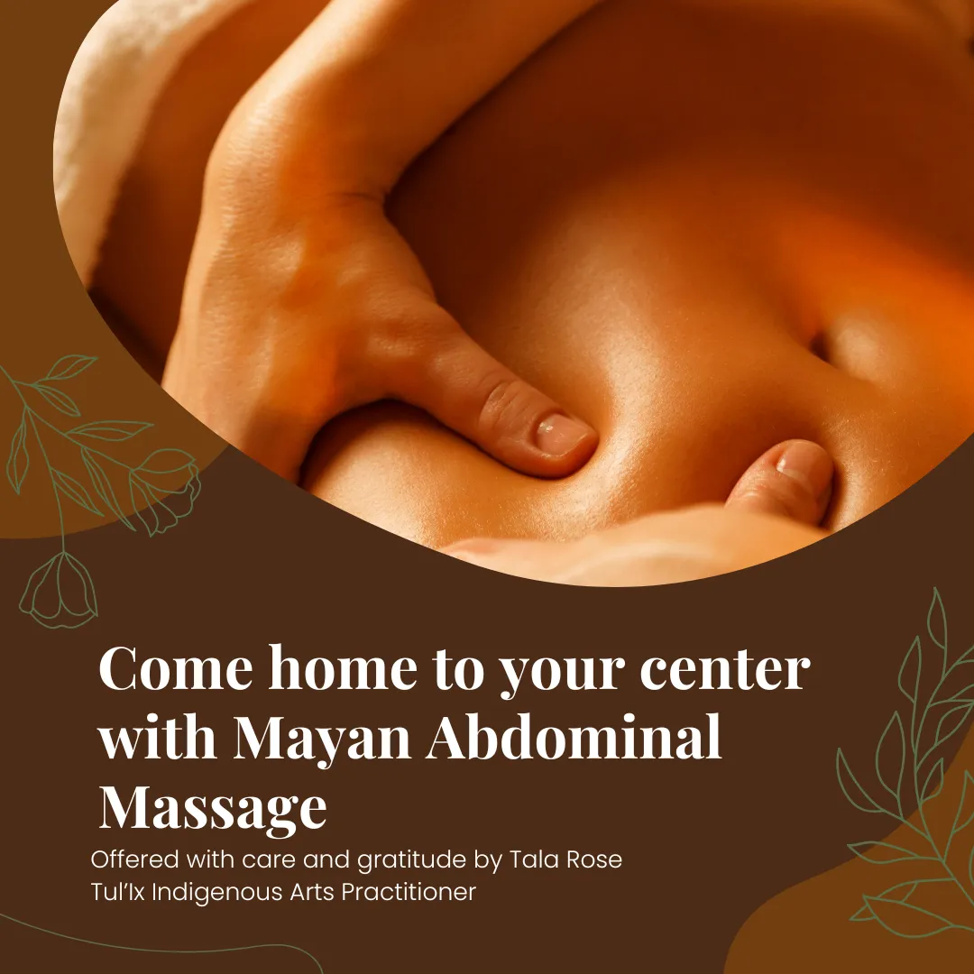 Mayan Abdominal Massage (Tul’Ix Indigenous Arts) — Gentle, lineage-honoring abdominal & pelvic care. Initial 1.5 hrs with intake + self-care teaching; follow-ups 1.5–2 hrs. Optional pelvic steaming (+30 min). Consent-led, external touch.
